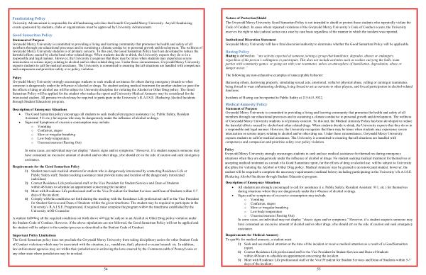 Good Samaritan Policy Statement of Purpose Gwynedd Mercy University is committed to providing a living and learning community that promotes the health and safety of all members through our educational processes and in sustaining a climate conducive to personal growth and development . The wellness of Gwynedd Mercy University students is of primary concern . To this end , the Good Samaritan Policy has been developed to reduce the harmful effects caused by alcohol and other related drugs . When students decide to drink , the University expects they do so in a responsible and legal manner . However , the University recognizes that there may be times when students may experience severe intoxication or serious injury relating to alcohol and / or other related drug use . Under those circumstances , Gwynedd Mercy University expects students to call for medical assistance . The University is committed to ensuring that all situations are handled with competence and compassion and prioritize safety over policy violation .