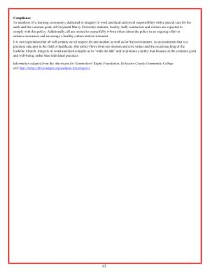 It is our expectation that all will comply out of respect for one another as well as for the environment . As an institution that is a premiere educator in the field of healthcare , this policy flows from our mission and core values and the social teaching of the Catholic Church . Integrity of word and deed compels us to “ walk the talk ” and to promote a policy that focuses on the common good and well-being , rather than individual practices .