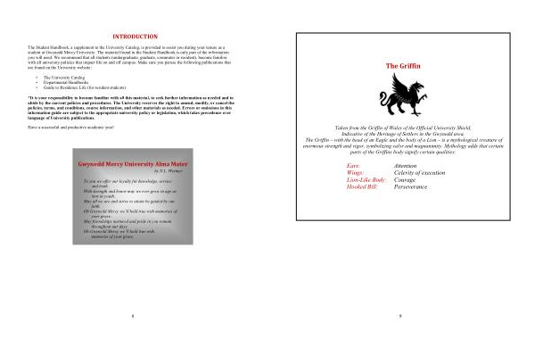 The Student Handbook , a supplement to the University Catalog , is provided to assist you during your tenure as a student at Gwynedd Mercy University . The material found in the Student Handbook is only part of the information you will need . We recommend that all students ( undergraduate , graduate , commuter or resident ), become familiar with all university policies that impact life on and off campus . Make sure you peruse the following publications that are found on the University website :