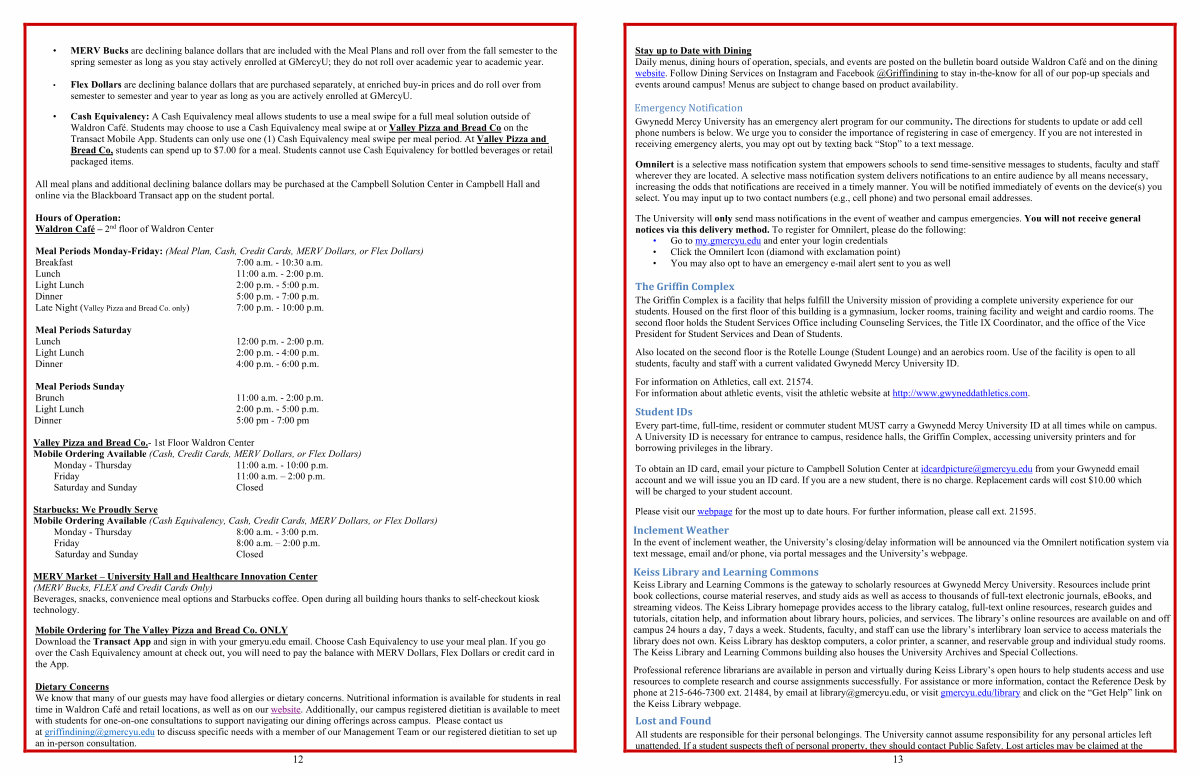 Stay up to Date with Dining Daily menus, dining hours of operation, specials, and events are posted on the bulletin board outside Waldron Café and on the dining website. Follow Dining Services on Instagram and Facebook @ Griffindining to stay in-the-know for all of our pop-up specials and events around campus! Menus are subject to change based on product availability.