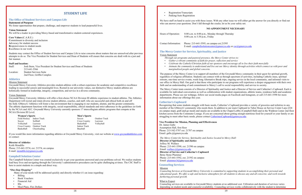 The Mercy Center team consists of a Director of Spirituality and Justice and a Director of Service and Catherine’ s Cupboard. Each is available for individual conversation as well as collaboration with student organizations, athletic teams, residence halls and academic departments. Please see our webpage, follow our social media pages on Facebook and Instagram, or call 215-641-5590 for more information about our offerings this year.