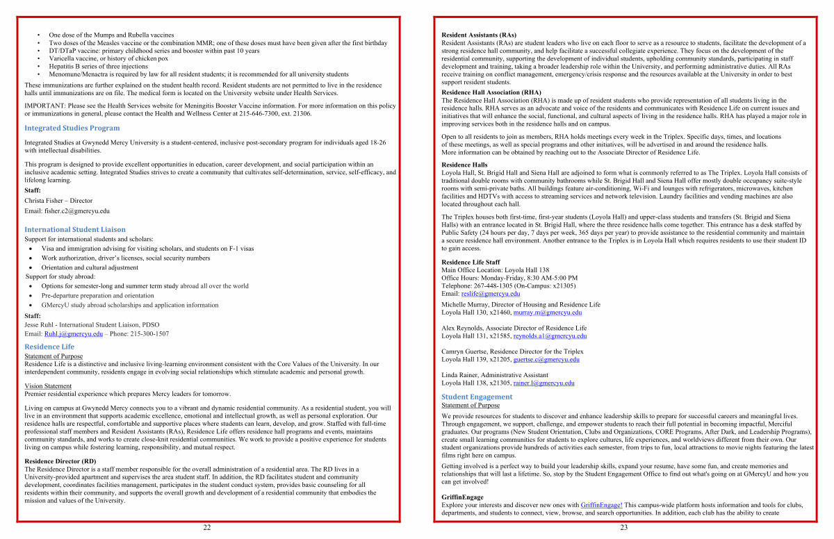 Living on campus at Gwynedd Mercy connects you to a vibrant and dynamic residential community. As a residential student, you will live in an environment that supports academic excellence, emotional and intellectual growth, as well as personal exploration. Our residence halls are respectful, comfortable and supportive places where students can learn, develop, and grow. Staffed with full-time professional staff members and Resident Assistants( RAs), Residence Life offers residence hall programs and events, maintains community standards, and works to create close-knit residential communities. We work to provide a positive experience for students living on campus while fostering learning, responsibility, and mutual respect.
