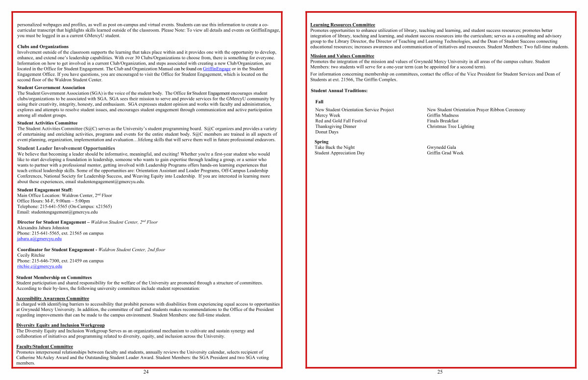 Mission and Values Committee Promotes the integration of the mission and values of Gwynedd Mercy University in all areas of the campus culture. Student Members: two students will serve for a one-year term( can be appointed for a second term).