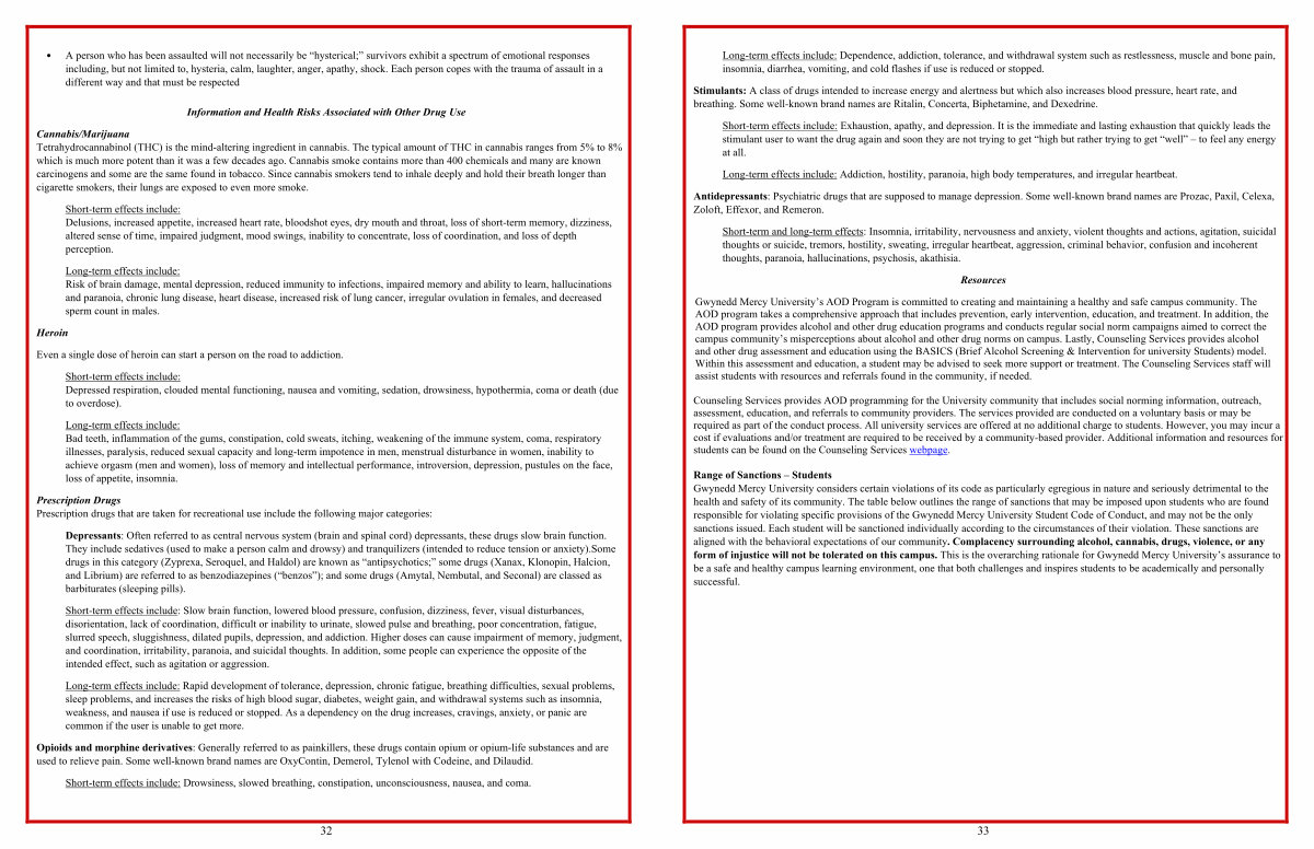 Range of Sanctions – Students Gwynedd Mercy University considers certain violations of its code as particularly egregious in nature and seriously detrimental to the health and safety of its community. The table below outlines the range of sanctions that may be imposed upon students who are found responsible for violating specific provisions of the Gwynedd Mercy University Student Code of Conduct, and may not be the only sanctions issued. Each student will be sanctioned individually according to the circumstances of their violation. These sanctions are aligned with the behavioral expectations of our community. Complacency surrounding alcohol, cannabis, drugs, violence, or any form of injustice will not be tolerated on this campus. This is the overarching rationale for Gwynedd Mercy University’ s assurance to be a safe and healthy campus learning environment, one that both challenges and inspires students to be academically and personally successful.