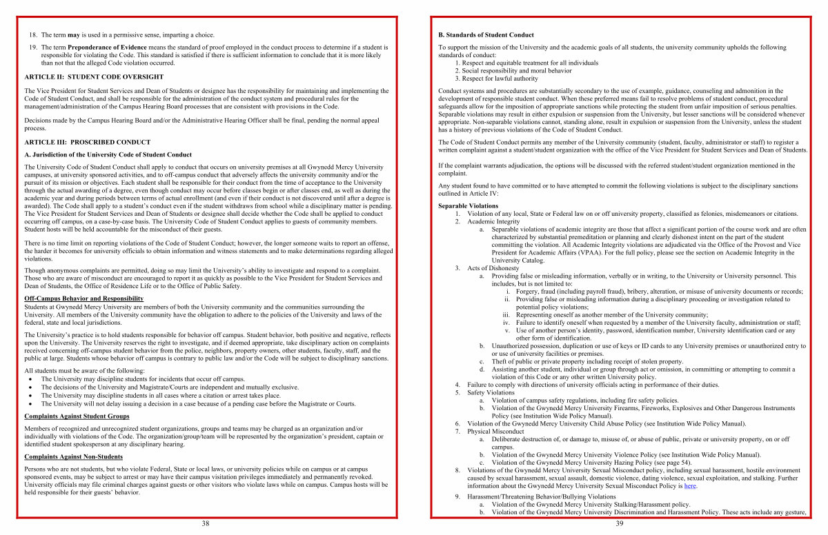 Deliberate destruction of, or damage to, misuse of, or abuse of public, private or university property, on or off campus. b. Violation of the Gwynedd Mercy University Violence Policy( see Institution Wide Policy Manual). c. Violation of the Gwynedd Mercy University Hazing Policy( see page 54).
