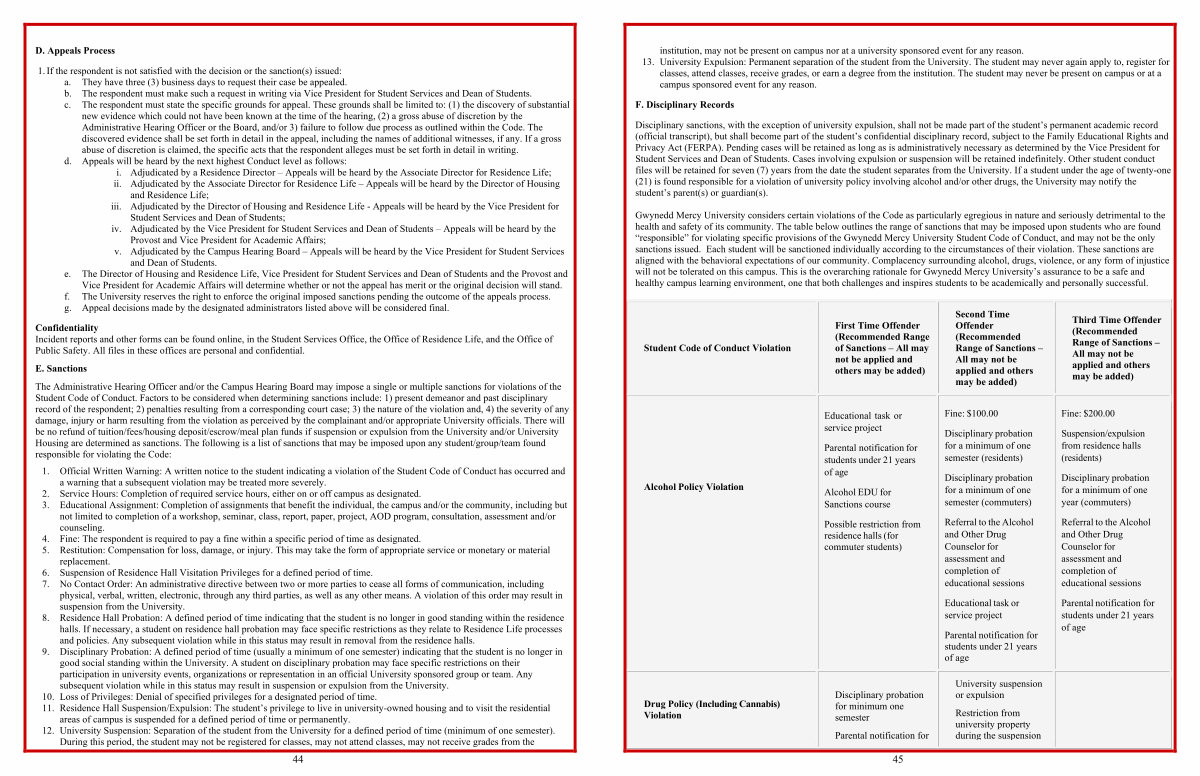 1. Official Written Warning: A written notice to the student indicating a violation of the Student Code of Conduct has occurred and a warning that a subsequent violation may be treated more severely. 2. Service Hours: Completion of required service hours, either on or off campus as designated. 3. Educational Assignment: Completion of assignments that benefit the individual, the campus and / or the community, including but not limited to completion of a workshop, seminar, class, report, paper, project, AOD program, consultation, assessment and / or counseling. 4. Fine: The respondent is required to pay a fine within a specific period of time as designated. 5. Restitution: Compensation for loss, damage, or injury. This may take the form of appropriate service or monetary or material replacement. 6. Suspension of Residence Hall Visitation Privileges for a defined period of time. 7. No Contact Order: An administrative directive between two or more parties to cease all forms of communication, including physical, verbal, written, electronic, through any third parties, as well as any other means. A violation of this order may result in suspension from the University.