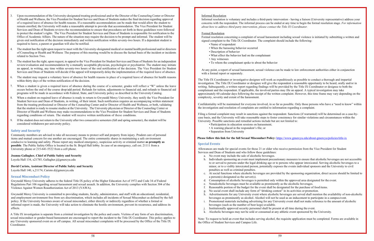 Gwynedd Mercy University adheres to the federal Title IX policy of the Higher Education Act of 1972 and Code 34 of Federal Regulations Part 106 regarding sexual harassment and sexual assault. In addition, the University complies with Section 304 of the Violence Against Women Reauthorization Act of 2013( VAWA).