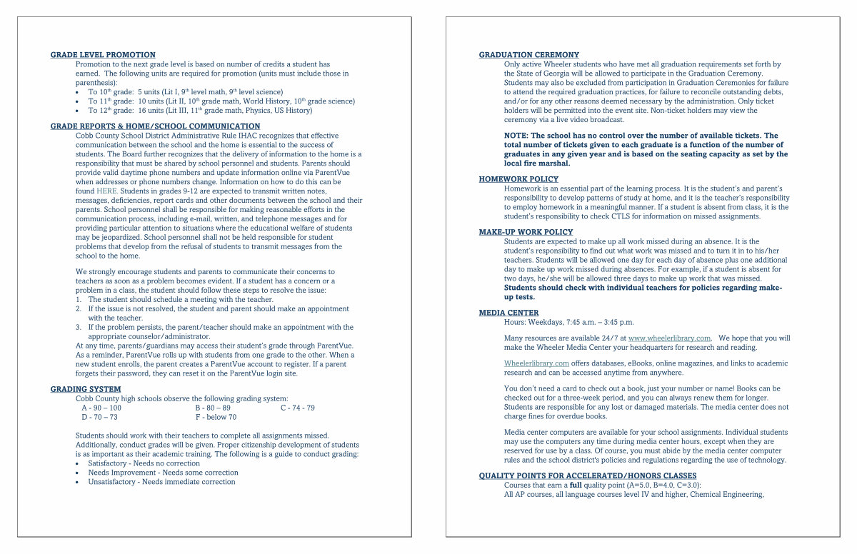 GRADE REPORTS & HOME / SCHOOL COMMUNICATION Cobb County School District Administrative Rule IHAC recognizes that effective communication between the school and the home is essential to the success of students. The Board further recognizes that the delivery of information to the home is a responsibility that must be shared by school personnel and students. Parents should provide valid daytime phone numbers and update information online via ParentVue when addresses or phone numbers change. Information on how to do this can be found HERE. Students in grades 9-12 are expected to transmit written notes, messages, deficiencies, report cards and other documents between the school and their parents. School personnel shall be responsible for making reasonable efforts in the communication process, including e-mail, written, and telephone messages and for providing particular attention to situations where the educational welfare of students may be jeopardized. School personnel shall not be held responsible for student problems that develop from the refusal of students to transmit messages from the school to the home.
