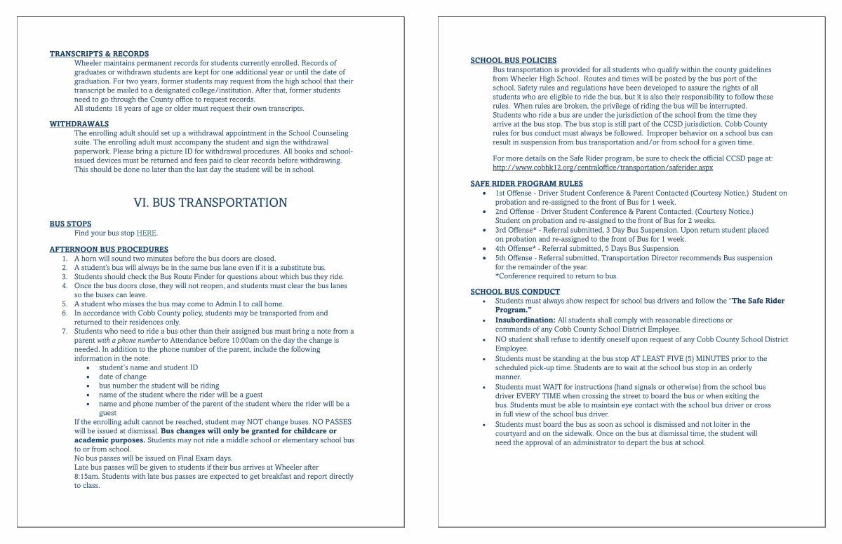 SCHOOL BUS POLICIES Bus transportation is provided for all students who qualify within the county guidelines from Wheeler High School. Routes and times will be posted by the bus port of the school. Safety rules and regulations have been developed to assure the rights of all students who are eligible to ride the bus, but it is also their responsibility to follow these rules. When rules are broken, the privilege of riding the bus will be interrupted. Students who ride a bus are under the jurisdiction of the school from the time they arrive at the bus stop. The bus stop is still part of the CCSD jurisdiction. Cobb County rules for bus conduct must always be followed. Improper behavior on a school bus can result in suspension from bus transportation and / or from school for a given time.