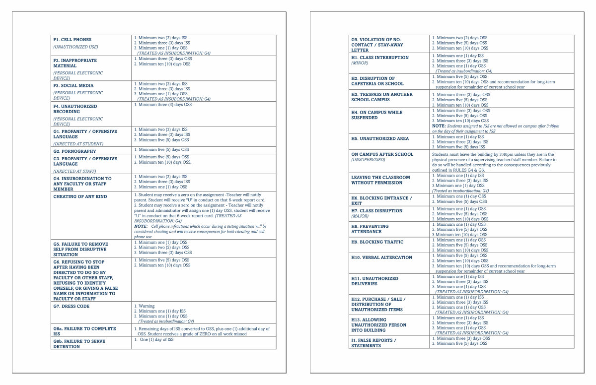 1. Student may receive a zero on the assignment-Teacher will notify parent. Student will receive " U " in conduct on that 6-week report card. 2. Student may receive a zero on the assignment- Teacher will notify parent and administrator will assign one( 1) day OSS, student will receive“ U” in conduct on that 6-week report card.( TREATED AS INSUBORDINATION: G4) NOTE: Cell phone infractions which occur during a testing situation will be considered cheating and will receive consequences for both cheating and cell phone use. 1. 1. Minimum one( 1) day OSS 2. 2. Minimum two( 2) days OSS 3. Minimum three( 3) days OSS