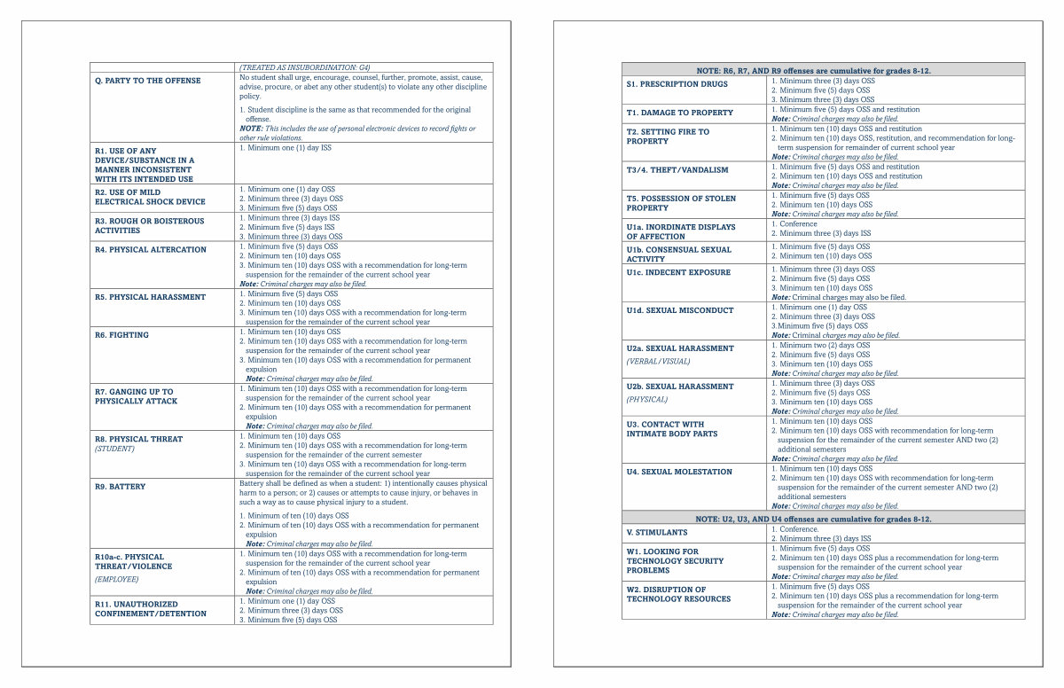 NOTE: U2, U3, AND U4 offenses are cumulative for grades 8-12. 1. Conference. 2. Minimum three( 3) days ISS 1. Minimum five( 5) days OSS 2. Minimum ten( 10) days OSS plus a recommendation for long-term suspension for the remainder of the current school year Note: Criminal charges may also be filed. 1. Minimum five( 5) days OSS 2. Minimum ten( 10) days OSS plus a recommendation for long-term suspension for the remainder of the current school year Note: Criminal charges may also be filed.