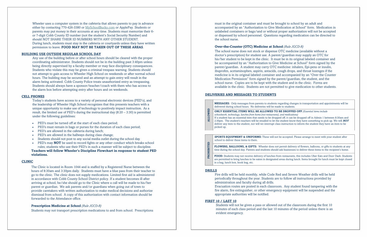 BUILDING USE OUTSIDE REGULAR SCHOOL DAY Any use of the building before or after school hours should be cleared with the proper coordinating administrator. Students should not be in the building past 3:40pm unless being directly supervised by a faculty member or may face disciplinary consequences. Students who violate this may be given a criminal trespass warning. Students should not attempt to gain access to Wheeler High School on weekends or after normal school hours. The building may be secured and an attempt to gain entry will result in the alarm being activated. Cobb County Police treats unauthorized entry as trespassing. Students should always have a sponsor / teacher / coach with them who has access to the alarm box before attempting entry after hours and on weekends.