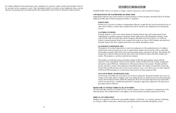 CONSEQUENCES OF INAPPROPRIATE BEHAVIOR Inappropriate behavior may result in denial of certain privileges, teacher detention, Saturday School, In-School Suspension( ISS), Out-of School Suspension( OSS), or expulsion.