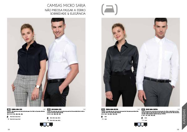 120 g/m² • 100% algodão (micro sarja). Tecido que não precisa passar a ferro. Punho grande que pode dobrar. Punhos