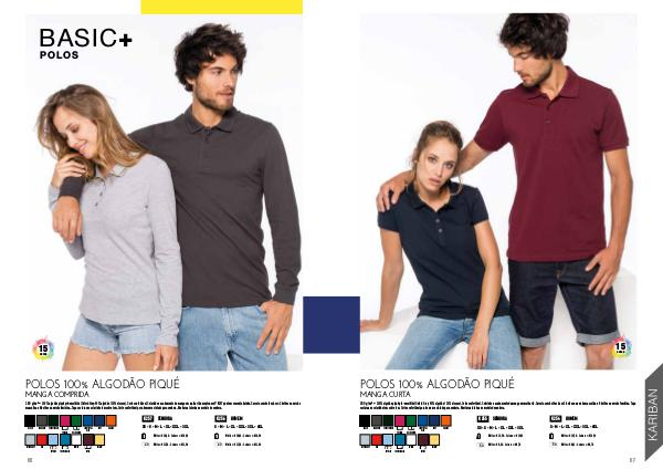 180 g/m² • 100% algodão piqué pré-encolhido (Oxford Grey: 90% algodão / 10% viscose). Corte confortável. Colarinho e acabamento da manga em malha rib excepto na refª K257 que tem somente bainha. Carcela com botões à cor: 3 botões na versão
