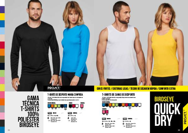 140 g/m² • 100% Poliéster. Tecido leve e de secagem rápida. Decote redondo. Tapa costuras. Acabamento com