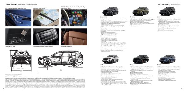 260-hp 2.4-litre 4-cylinder Direct Injection Turbocharged ( DIT ®) SUBARU BOXER ® engine EyeSight ® Driver Assist Technology with wide-angle mono camera 5 Subaru Symmetrical Full-Time All-Wheel Drive with X-MODE ® Lineartronic ® CVT with Active Torque Vectoring 2270-kg max towing capacity 18-inch aluminum-alloy wheels in grey with machine finish LED Steering Responsive Headlights with High Beam Assist LED fog lights Raised roof rails Heated body-colour side mirrors with integrated turn signals Privacy glass Proximity key with Push-Button Start Power Rear Gate with vehicle lock button Spill-resistant premium cloth upholstery 8-way power-adjustable driver seat Heated front seats Leather-wrapped , heated steering wheel Second-row bench seat ( 8 passengers ) Tri-zone automatic climate control system 6 USB ports 11.6-inch tablet-style infotainment system with high-resolution touchscreen display , wireless Apple CarPlay ® 2 and Android™ Auto 3 functionality , 6 speakers , USB-A and USB-C input ports , Bluetooth ® 6 and SiriusXM ® capability 7 Blind-Spot Detection with Lane Change Assist and Rear Cross- Traffic Alert 8 Reverse Automatic Braking 9 SUBARU STARLINK Connected Services ( free 3-year trial subscription included ) 10