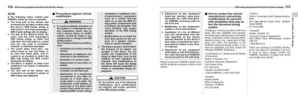 Changing or moving any parts of the front seats , rear seat , seatbelts , front bumper , front side frame , radiator panel , instrument panel , combination meter , steering wheel , steering column , tire , suspension or floor panel can affect the operation of the SUBARU advanced airbag system . If you have any questions , you may contact the following SUBARU distributors .