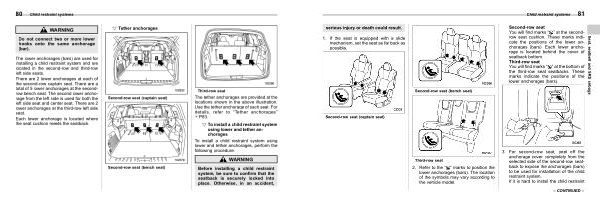 The tether anchorages are provided at the locations shown in the above illustration . Use the tether anchorage of each seat . For details , refer to “ Tether anchorages ” FP83 .