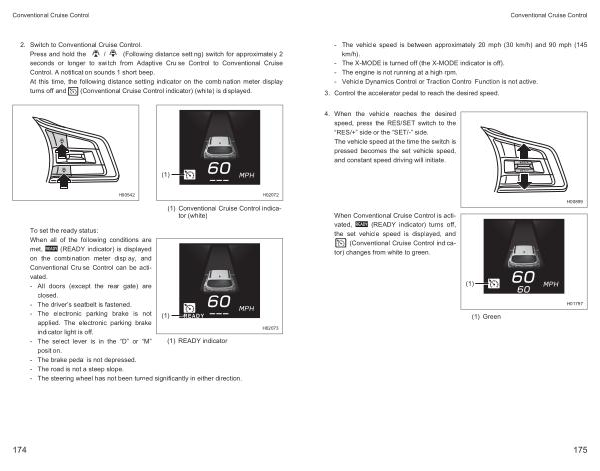 When Conventional Cruise Control is activated , ( READY indicator ) turns off , the set vehicle speed is displayed , and