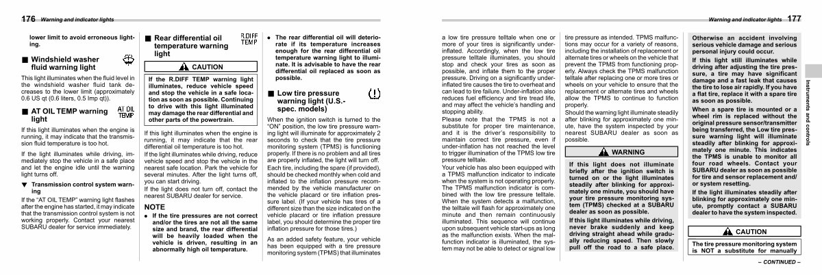 If the“ AT OIL TEMP” warning light flashes after the engine has started, it may indicate that the transmission control system is not working properly. Contact your nearest SUBARU dealer for service immediately.