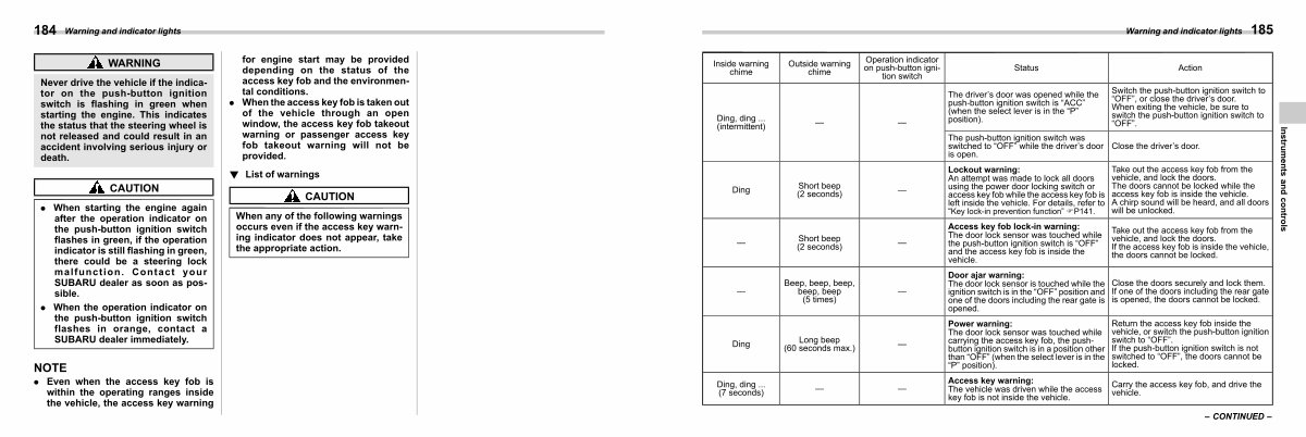 . When the operation indicator on the push-button ignition switch flashes in orange, contact a SUBARU dealer immediately.