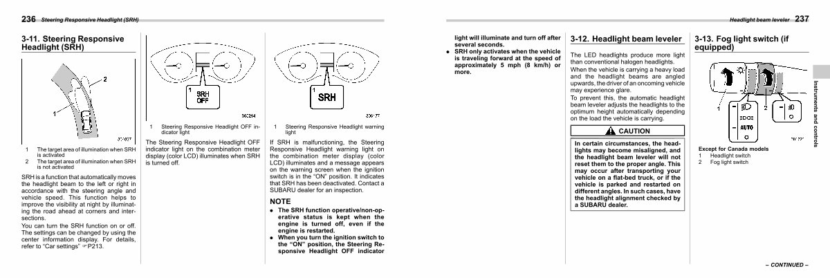 If SRH is malfunctioning, the Steering Responsive Headlight warning light on the combination meter display( color LCD) illuminates and a message appears on the warning screen when the ignition switch is in the“ ON” position. It indicates that SRH has been deactivated. Contact a SUBARU dealer for an inspection.
