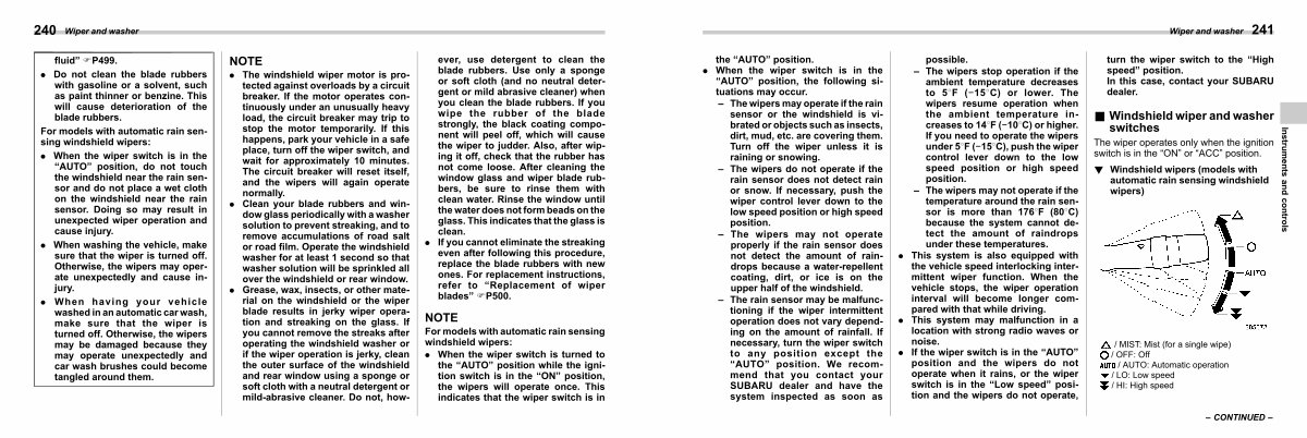 . When the wiper switch is turned to the“ AUTO” position while the ignition switch is in the“ ON” position, the wipers will operate once. This indicates that the wiper switch is in