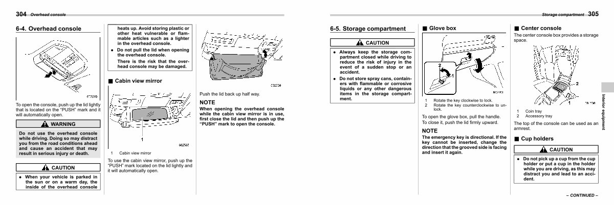 When opening the overhead console while the cabin view mirror is in use, first close the lid and then push up the“ PUSH” mark to open the console.