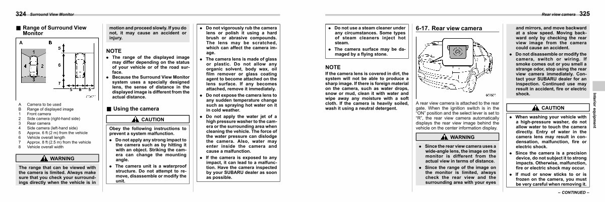 . Do not disassemble or modify the camera, switch or wiring. If smoke comes out or you smell a strange odor, stop using the rear view camera immediately. Contact your SUBARU dealer for an inspection. Continued use may result in accident, fire or electric shock.