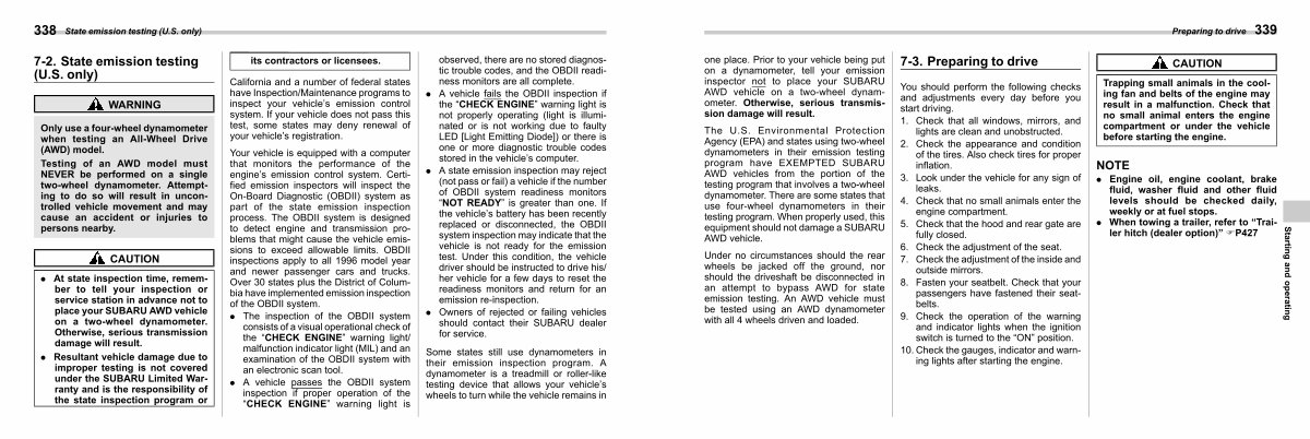 one place. Prior to your vehicle being put on a dynamometer, tell your emission inspector not to place your SUBARU AWD vehicle on a two-wheel dynamometer. Otherwise, serious transmission damage will result.