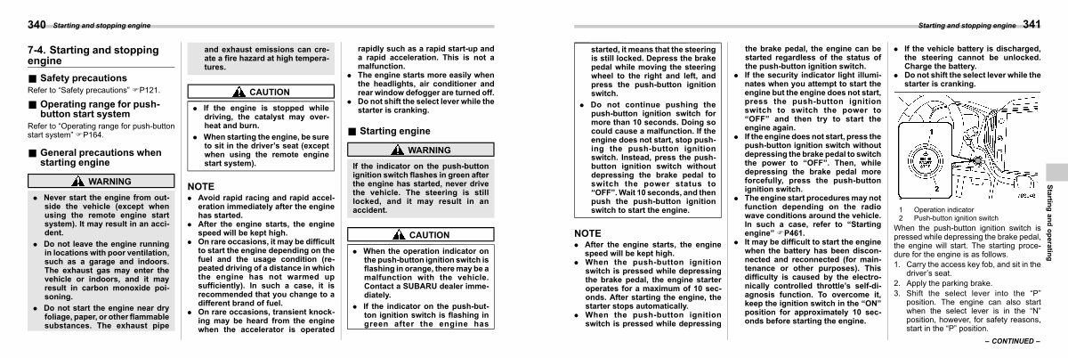 . When the operation indicator on the push-button ignition switch is flashing in orange, there may be a malfunction with the vehicle. Contact a SUBARU dealer immediately.