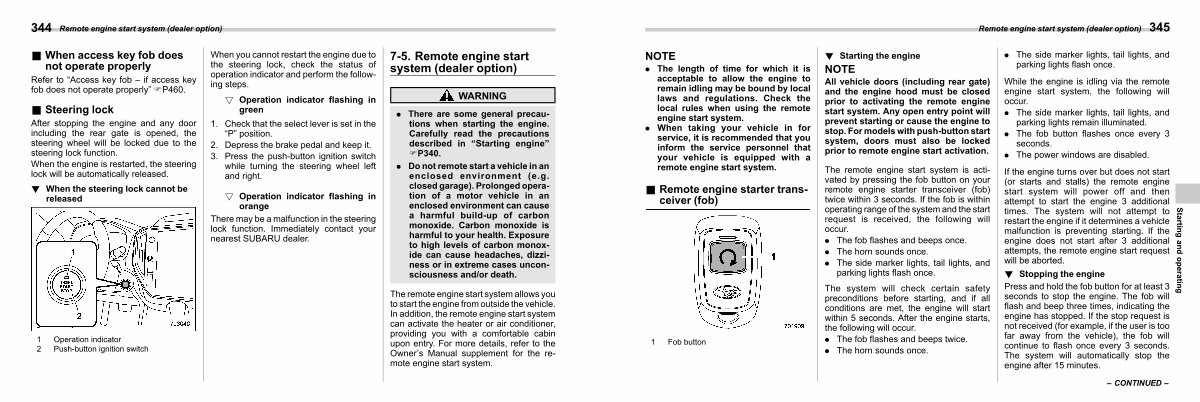 All vehicle doors( including rear gate) and the engine hood must be closed prior to activating the remote engine start system. Any open entry point will prevent starting or cause the engine to stop. For models with push-button start system, doors must also be locked prior to remote engine start activation.