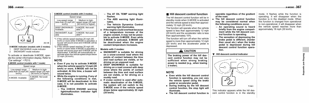 The hill descent control function will be in standby mode when X-MODE is activated and the vehicle speed is less than approximately 12 mph( 20 km / h).