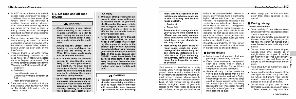 . Frequent driving of an AWD vehicle under hard-driving conditions such as steep hills or dusty roads will necessitate more frequent replacement of the following items than that specified in the“ Warranty and Maintenance Booklet”. – Engine oil – Brake fluid – Rear differential gear oil – Continuously variable transmission fluid – Front differential gear oil