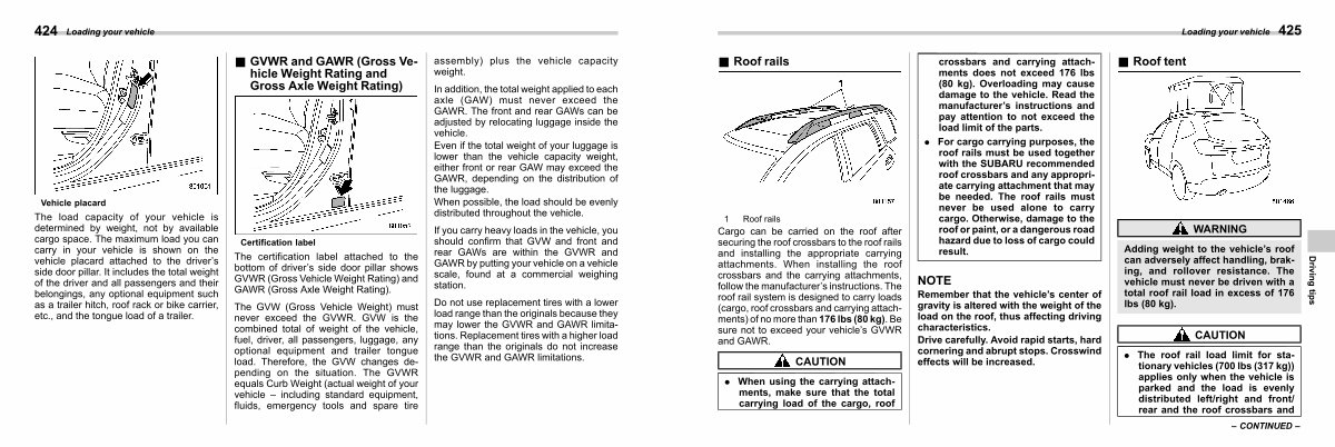 Cargo can be carried on the roof after securing the roof crossbars to the roof rails and installing the appropriate carrying attachments. When installing the roof crossbars and the carrying attachments, follow the manufacturer’ s instructions. The roof rail system is designed to carry loads( cargo, roof crossbars and carrying attachments) of no more than 176 lbs( 80 kg). Be sure not to exceed your vehicle’ s GVWR and GAWR.