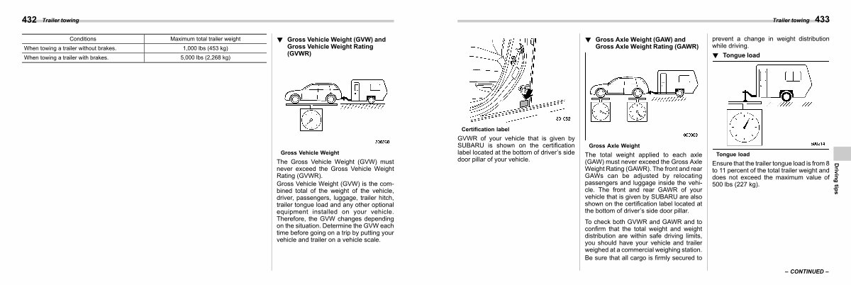The total weight applied to each axle( GAW) must never exceed the Gross Axle Weight Rating( GAWR). The front and rear GAWs can be adjusted by relocating passengers and luggage inside the vehicle. The front and rear GAWR of your vehicle that is given by SUBARU are also shown on the certification label located at the bottom of driver’ s side door pillar.