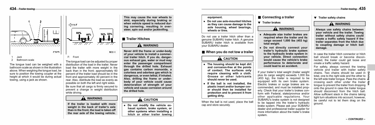 If your trailer’ s total weight( trailer weight plus its cargo weight) exceeds 1,000 lbs( 453 kg), the trailer is required to be equipped with its own brake system. Electric brakes or surge brakes are recommended, and must be installed properly. Check that your trailer’ s brakes conform with Federal, state / province and / or other applicable regulations. Your SUBARU’ s brake system is not designed to be tapped into the trailer’ s hydraulic brake system. Please ask your SUBARU dealer and professional trailer supplier for more information about the trailer’ s brake system.