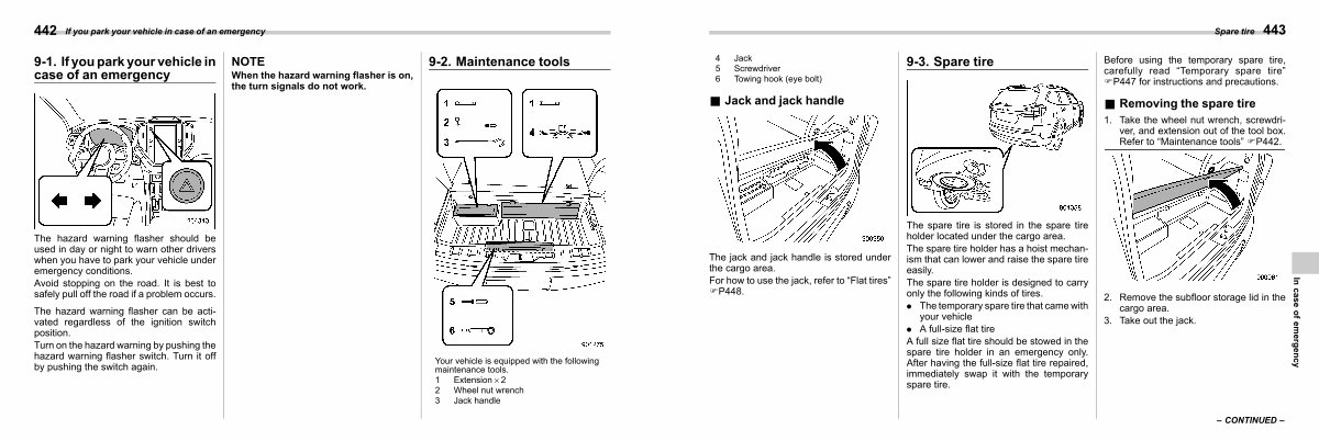 Before using the temporary spare tire, carefully read“ Temporary spare tire” FP447 for instructions and precautions. |
