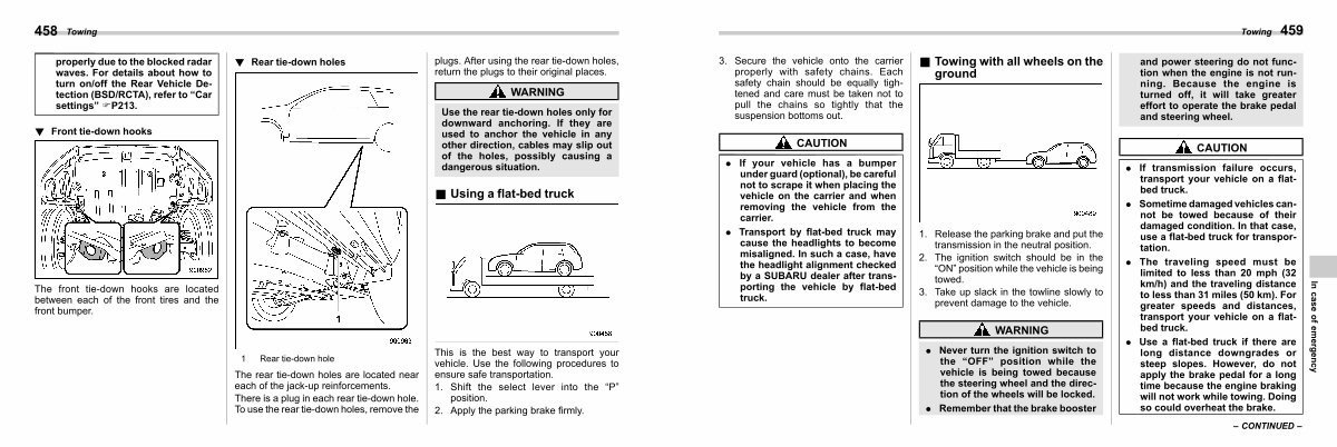 . Transport by flat-bed truck may cause the headlights to become misaligned. In such a case, have the headlight alignment checked by a SUBARU dealer after transporting the vehicle by flat-bed truck.