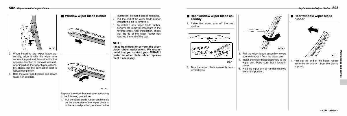 It may be difficult to perform the wiper blade rubber replacement. We recommend that you contact your SUBARU dealer for wiper blade rubber replacement if necessary.