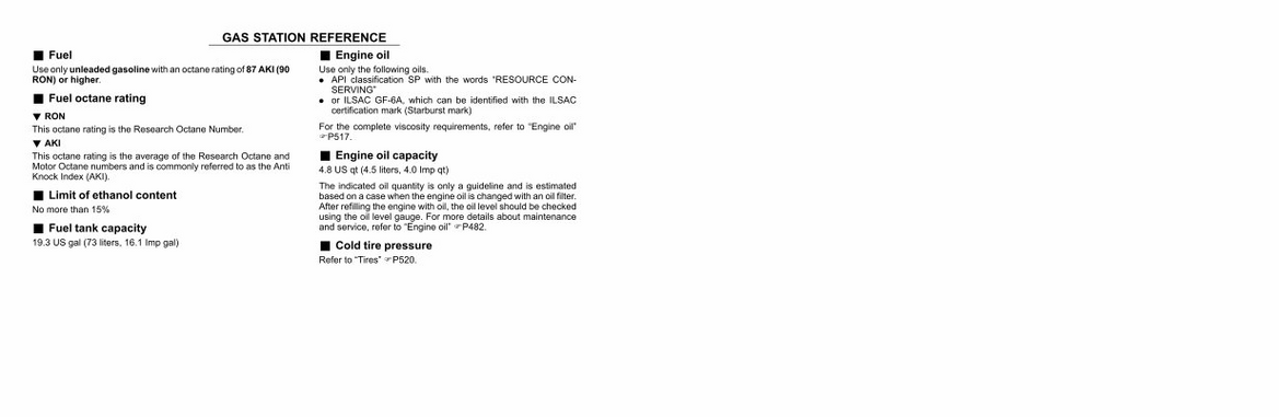 The indicated oil quantity is only a guideline and is estimated based on a case when the engine oil is changed with an oil filter. After refilling the engine with oil, the oil level should be checked using the oil level gauge. For more details about maintenance and service, refer to“ Engine oil” FP482.