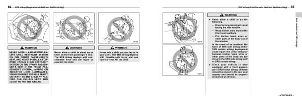 NEVER INSTALL A REARWARD FA- CING CHILD RESTRAINT SYSTEM ON THE FRONT PASSENGER ’ S SEAT , AND NEVER INSTALL A FOR- WARD FACING CHILD RESTRAINT SYSTEM ON THE FRONT PASSEN- GER ’ S SEAT IF THE FRONT PAS- SENGER ’ S FRONTAL AIRBAG ON INDICATOR LIGHT ILLUMINATES . DOING SO RISKS SERIOUS INJURY OR DEATH TO THE CHILD BY PLA- CING THE CHILD ’ S HEAD TOO CLOSE TO THE SRS AIRBAG .