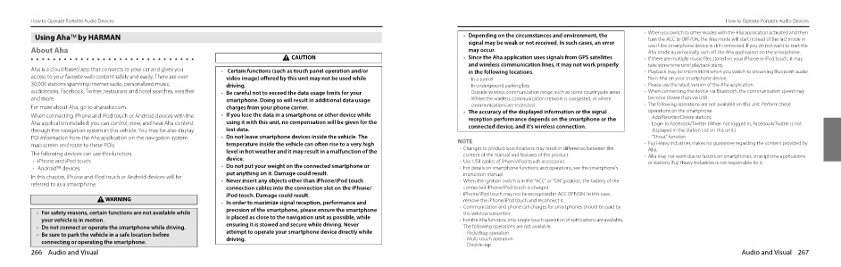 How to Operate Portable Audio Devices Using Aha by HARMAN About Aha CAUTION Aha is a cloud-based app that connects to your car and gives you access to your favorite web content safely and easily. There are over 30,000 stations spanning internet radio, personalized music, audiobooks, Facebook, Twitter, restaurant and hotel searches, weather and more. For more about Aha, go to aharadio.com. When connecting iPhone and iPod touch or Android devices with the Aha application installed, you can control, view, and hear Aha content through the navigation system in this vehicle. You may be also display POI information from the Aha application on the navigation system map screen and route to these POIs. The following devices can use this function. • iPhone and iPod touch • Android devices In this chapter, iPhone and iPod touch or Android devices will be referred to as a smartphone. WARNING • For safety reasons, certain functions are not available while your vehicle is in motion. • Do not connect or operate the smartphone while driving. • Be sure to park the vehicle in a safe location before connecting or operating the smartphone. 266 Audio and Visual • Certain functions (such as touch panel operation and/or video image) offered by this unit may not be used while driving. • Be careful not to exceed the data usage limits for your smartphone. Doing so will result in additional data usage charges from your phone carrier. • If you lose the data in a smartphone or other device while using it with this unit, no compensation will be given for the lost data. • Do not leave smartphone devices inside the vehicle. The temperature inside the vehicle can often rise to a very high level in hot weather and it may result in a malfunction of the device. • Do not put your weight on the connected smartphone or put anything on it. Damage could result. • Never insert any objects other than iPhone/iPod touch connection cables into the connection slot on the iPhone/ iPod touch. Damage could result. • In order to maximize signal reception, performance and precision of the smartphone, please ensure the smartphone is placed as close to the navigation unit as possible, while ensuring it is stowed and secure while driving. Never attempt to operate your smartphone device directly while driving.