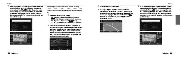 Navigation 5 After a summary of the route plan is displayed, the entire route is displayed on the map. The route is researched automatically. Touch More (More) to change the route plan, or touch Go! (Go!) to start navigation. (When the countdown is displayed in the “Go!” button, guidance begins automatically after 10 seconds even if you do not touch the button.) Selecting a Recent Destination from History Destinations that have been set previously are displayed in the History list. 1 Use the History function as follows. • If the Map screen is displayed, touch and then touch History (History). (Only when registered to the Quick Menu.) • If the Map screen is displayed, touch Menu (Menu), Destination (Destination) and then touch History (History). 2 132 Navigation A list of recently entered destinations is displayed. A History search displays three destination on the top page based on previously entered routes (destinations with the highest likelihood of use). Other destinations are displayed based on the time they were entered in the past. If necessary, scroll through the list to display older entries and select the destination.