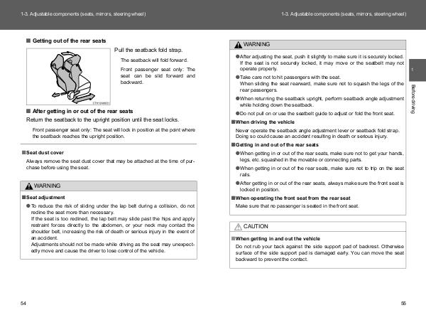1-3. Adjustable components (seats, mirrors, steering wheel)
