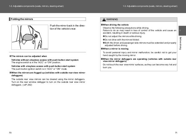 1-3. Adjustable components (seats, mirrors, steering wheel)