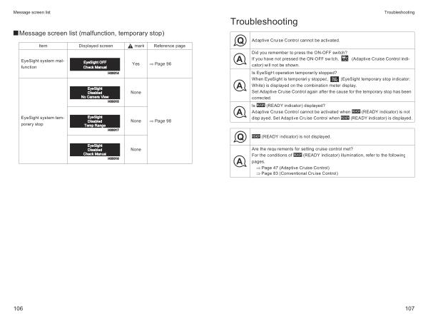 Message screen list 106 ■ Message screen list ( malfunction , temporary stop ) Item Displayed screen mark Reference page EyeSight system malfunction Yes � Page 96 EyeSight system temporary stop None � Page 98 None None EyeSight OFF Check Manual H00014 EyeSight No Camera View Disabled H00015 EyeSight Temp Range Disabled H00017 EyeSight Check Manual Disabled H00018