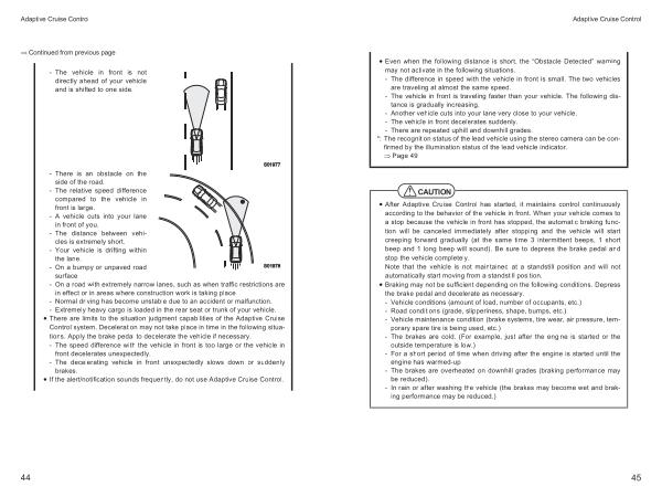 • Even when the following distance is short , the “ Obstacle Detected ” warning may not activate in the following situations . - The difference in speed with the vehicle in front is small . The two vehicles are traveling at almost the same speed . - The vehicle in front is traveling faster than your vehicle . The following distance is gradually increasing . - Another vehicle cuts into your lane very close to your vehicle . - The vehicle in front decelerates suddenly . - There are repeated uphill and downhill grades .