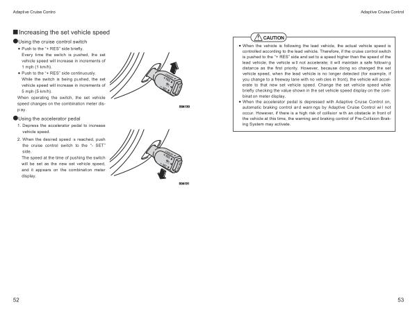 • When the vehicle is following the lead vehicle , the actual vehicle speed is controlled according to the lead vehicle . Therefore , if the cruise control switch is pushed to the “+ RES ” side and set to a speed higher than the speed of the lead vehicle , the vehicle will not accelerate ; it will maintain a safe following distance as the first priority . However , because doing so changed the set vehicle speed , when the lead vehicle is no longer detected ( for example , if you change to a freeway lane with no vehicles in front ), the vehicle will accelerate to that new set vehicle speed . Change the set vehicle speed while briefly checking the value shown in the set vehicle speed display on the combination meter display .